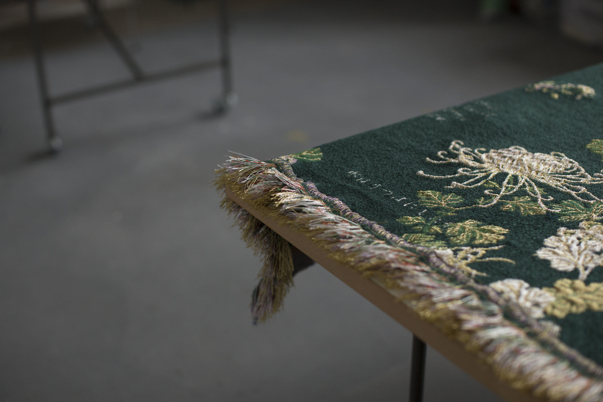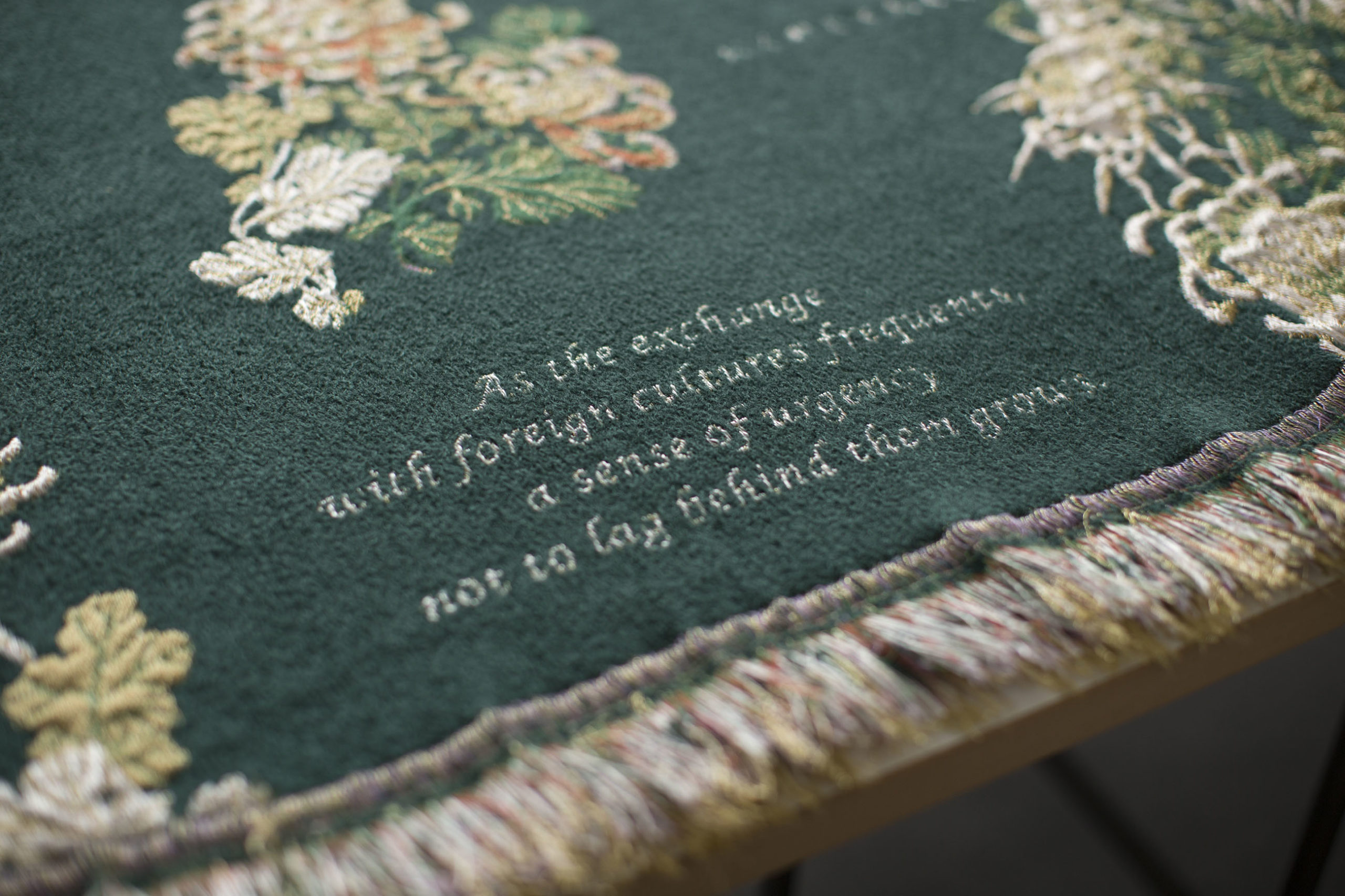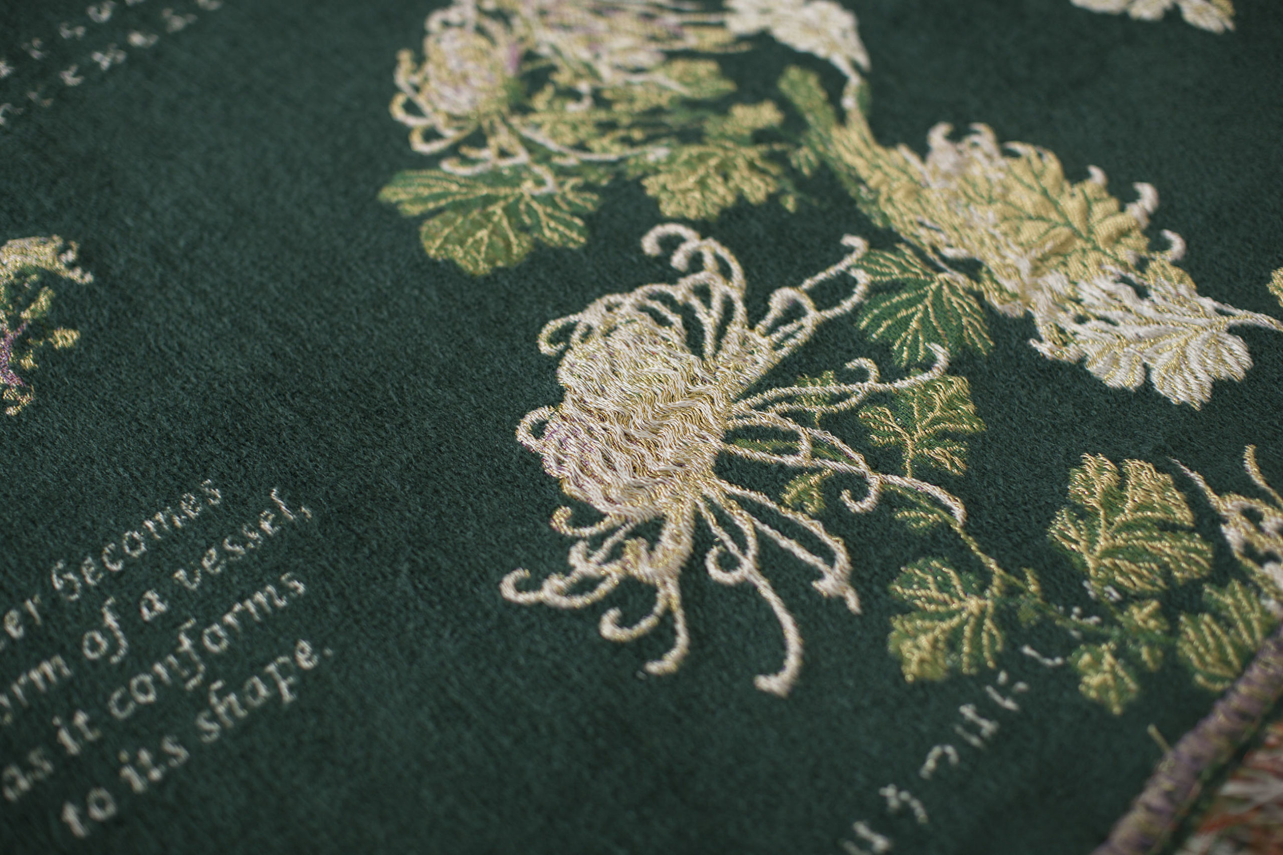Empress Shōken was a unique individual who actively embraced change with strong conviction and self-belief despite being at the mercy of the time. Empathizing with the situation in which the Empress was placed in relation to the Westernization of women’s clothing in Modern Japan, Tezuka attentively took apart the design of the court dress and redesigned it with the two pieces of Tanka poems composed by the Empress soon after the Westernization of women’s dresses at the Imperial Court. Later, the design was materialized into the magnificent fabric at the Textile Museum Lab in Tilburg and has been titled Dear Oblivion (A Study of Empress Haruko). The Tanka poems read: