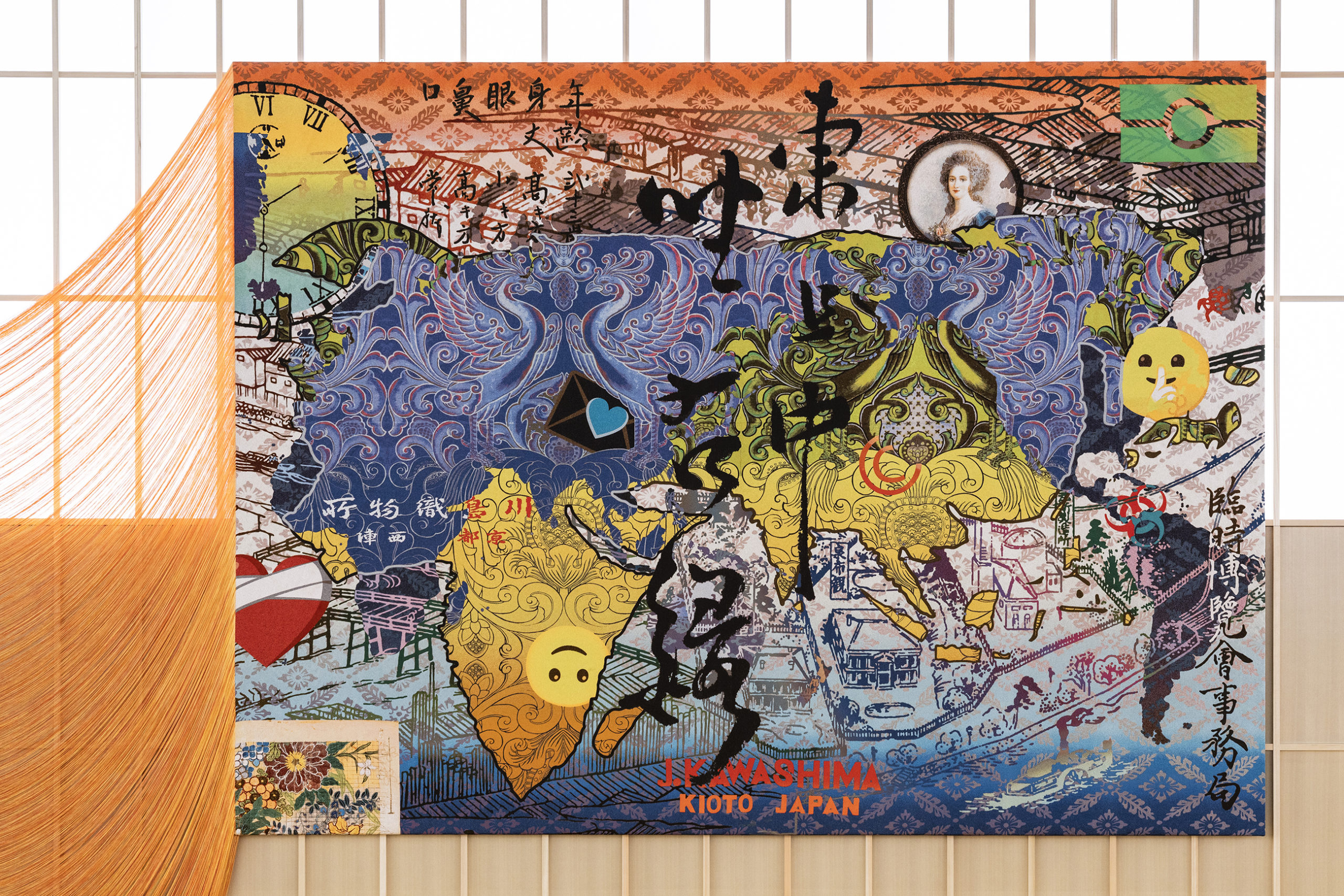 Scattered among the textiles on the left and right are a map of Japan and the world drawn during the period of national isolation (16th-17th centuries); a view of Osaka at the end of the 18th century (Yotsubashi, Shinsaibashi-suji and Karamono-ya: foreign goods shop); the government seal and physical characteristics of the recipient on Japan’s first passport; a British clock for learning the Western time system (first year of Meiji); the trademark and textile designs of Kawashima Textile, which laid the foundations for modern Japanese textiles (Meiji period); the handwriting of Jinbei Kawashima II (late 19th century); the handwriting of the sender on a letter addressed to Jinbei Kawashima II; documents related to the World Expo in the Meiji period (early 20th century); an exterior view of the Meiji-era State Guest House “Senpukan”; the IC chip in a modern passport; Emojis; symbols such as @ and ©, etc.